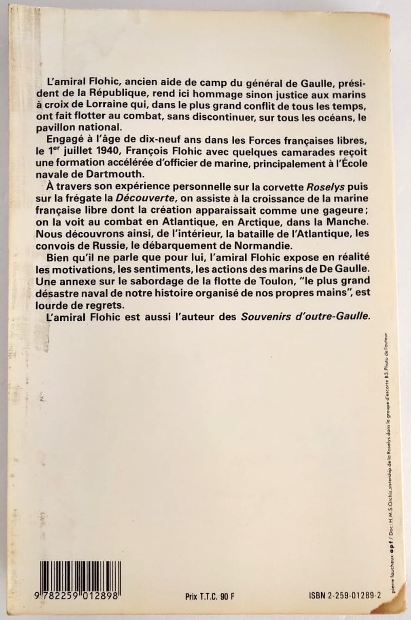 L’amiral Flohic, ancien aide de camp du général de Gaulle, président de la République, rend ici hommage sinon justice aux marins à croix de Lorraine qui, dans le plus grand conflit de tous les temps, ont fait flotter au combat, sans discontinuer, sur tous les océans, le pavillon national. Engagé à l’âge de dix-neuf ans dans les Forces françaises libres, le 1er juillet 1940, François Flohic avec quelques camarades reçoit une formation accélérée d’officier de marine, principalement à l’École navale de Dartmouth. À travers son expérience personnelle sur la corvette Roselys puis sur la frégate la Découverte, on assiste à la croissance de la marine française libre dont la création apparaissait comme une gageure ; on la voit au combat en Atlantique, en Arctique, dans la Manche. Nous découvrons ainsi, de l’intérieur, la bataille de l’Atlantique, les convois de Russie, le débarquement de Normandie. Bien qu’il ne parle que pour lui, l’amiral Flohic expose en réalité les motivations, les sentiments, les actions des marins de De Gaulle. Une annexe sur le sabordage de la flotte de Toulon, « le plus grand désastre naval de notre histoire organisé de nos propres mains », est lourde de regrets. L’amiral Flohic est aussi l’auteur des « Souvenirs d’outre-Gaulle ».