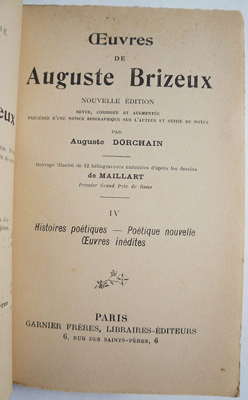 Titre : Oeuvres de Auguste BRIZEUX, nouvelle édition, revue corrigée et augmentée, précédée d’une notice biographique set suivie de notes par Auguste Dorchain.