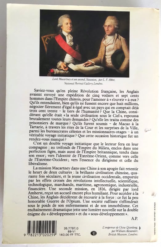 Saviez-vous qu’en pleine Révolution française, les Anglais avaient envoyé une expédition de cinq voiliers et sept cents hommes dans l’Empire chinois, pour l’amener à » s’ouvrir » à eux? Qu’ils entendaient, bien qu’ils ne fussent encore que huit millions, négocier fièrement d’égal à égal avec un pays qui en comptait déjà trois cent trente _ le tiers de l’humanité? Que la Chine, considérant qu’elle était » la seule civilisation sous le Ciel « , repoussa brutalement toutes leurs demandes? Qu’elle traita leurs envoyés comme des prisonniers de marque? Qu’ils furent soumis _ de Macao à la Tartarie, à travers les rites de la Cour et les surprises de la Ville, parmi les bureaucrates célestes et les missionnaires-otages _ à un véritable voyage initiatique? Que cette occasion historique fut un rendez-vous manqué?