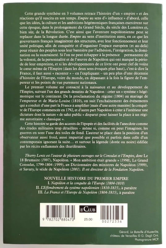Cette grande synthèse en 3 volumes retrace l’histoire d’un « empire » et des réactions qu’il suscita en son temps. Empire au sens d’« influence » d’abord, celle que les idées, la culture et les ambitions hégémoniques françaises exercèrent sur cette époque, dans le prolongement du Grand Siècle, du siècle des Lumières et, bien sûr, de la Révolution. C’est ainsi que l’aventure napoléonienne peut se replacer dans la longue durée. Empire au sens d’institution aussi, en ce que les gouvernants français imaginèrent des structures, avec leur fonctionnement et leur unité politique, afin de conquérir et d’organiser l’espace européen (et au-delà) pour réunir des peuples sous leur bannière par l’adhésion, l’intégration, la domination ou la suzeraineté. Si l’on ne peut échapper à la présence permanente de la volonté, de la personnalité et de l’œuvre de Napoléon qui ont marqué la période de leur empreinte, et si les développements de ce livre ont pour clef de voûte le cœur même de l’Empire (dans les deux sens évoqués plus haut), c’est-à-dire la France, il faut aussi « raconter » – en l’expliquant – un peu plus d’une décennie d’histoire de l’Europe, voire du monde, en dépassant à la fois la figure de l’empereur et les points de vue purement nationaux.