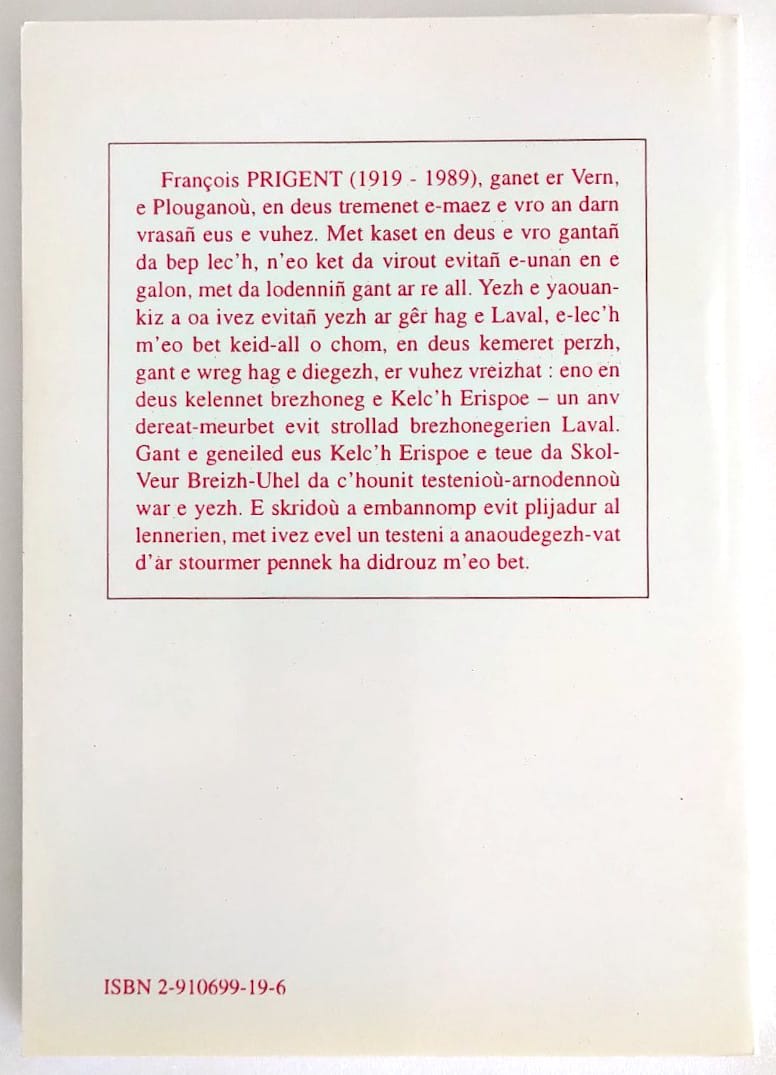 E galleg – en français: François Prigent (1919-1989), né dans la commune de Plougasnou (Trégor finistérien) raconte dans ce livre de nouvelles son enfance paysanne dans un village éloigné du bourg, avec tendresse, humour mais aussi tristesse, notamment par rapport à sa langue maternelle qui n’avait pas sa place à l’école.