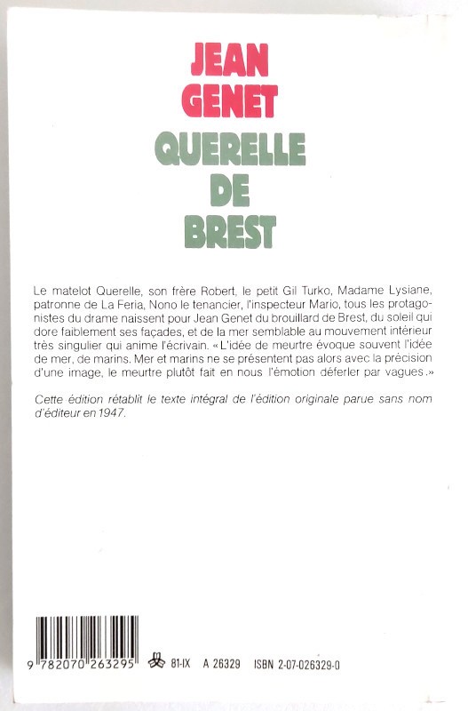 Le matelot Querelle, son frère Robert, le petit Gil Turko, Madame Lysiane, patronne de La Feria, Nono le tenancier, l’inspecteur Mario, tous les protagonistes du drame naissent pour Jean Genet du brouillard de Brest, du soleil qui dore faiblement ses façades, et de la mer semblable au mouvement intérieur très singulier qui anime l’écrivain.