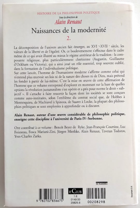 Ont contribué à ce volume : Benoît Beyer de Ryke, Jean-François Courtine, Luc Froisneau, Fosca Mariani-Zini, Jürgen Miethke, Alain Renaut, Tzvetan Todorov, Yves Charles Zarka.