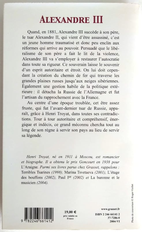 Quand, en 1881, Alexandre III succède à son père, le tsar Alexandre II, qui vient d’être assassiné, c’ est un jeune homme traumatisé et donc peu enclin aux réformes qui arrive au pouvoir. Persuadé que le libéralisme de son père a fait le lit de la violence, Alexandre III va s’employer à restaurer l’autocratie dans toute sa rigueur. Ce souverain laisse le souvenir d’un esprit autoritaire et étroit. On lui doit cependant la création du chemin de fer qui traverse les grandes plaines russes jusqu’aux neiges sibériennes. Egalement une gestion habile de la politique extérieure : il détacha la Russie de l’Allemagne et fut l’ artisan du rapprochement avec la France. Au centre d’une époque troublée, cet être assez fruste, qui fut l’avant-dernier tsar de Russie, apparaît, grâce à Henri Troyat, dans toutes ses contradictions. Tour à tour autoritaire et compréhensif, énergique et indécis, ce grand méconnu chercha tout au long de son règne à servir son pays au lieu de servir sa légende.