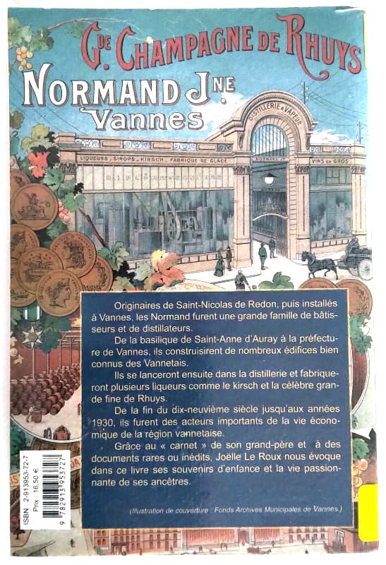 Famille originaire de Saint Nicolas de Redon, puis installée à Vannes, les Normand furent une grande famille de bâtisseurs et de distilleurs. De la basilique de Sainte Anne d’Auray à la préfecture de Vannes ils construisent de nombreux édifices bien connus des Vannetais. Ils se lanceront ensuite dans la distillerie et fabriqueront plusieurs liqueurs comme le kirsch et la célèbre grande fine de Rhüys. De la fin du dix-neuvième siècle jusqu’aux années 30, ils furent des acteurs importants de la vie économique de cette région du Morbihan. Joëlle Le Roux, descendante directe des Normand, nous raconte ici ses souvenirs d’enfance, et grâce aux recherches qu’elle a effectuées depuis de nombreuses années elle nous évoque dans ce livre la vie très active de ses ancêtres.