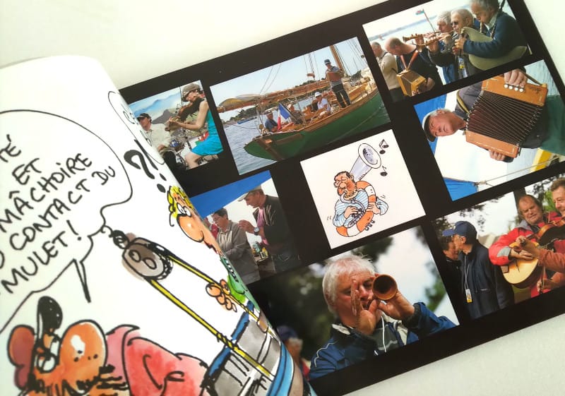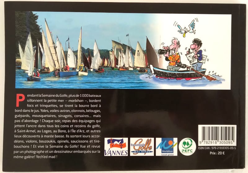 Pendant la Semaine du Golfe, plus de l000 bateaux sillonnent la petite mer – morbihan -, bordent focs et trinquettes, se tirent la bourre bord à bord dans le jus. Yoles, voiles-aviron, olonnois, bélougas, guépards, mousquetaires, sinagots, corsaires… mais pas d’abordage ! Chaque soir, repas des équipages qui jettent l’ancre dans tous les coins et recoins du golfe, à Saint-Armel, au Logeo, au Bono, à l’île d’Arz, et autres lieux découverts à marée basse. Ils sortent leurs accordéons, violons, bouzoukis, opinels, saucissons et tire-bouchons ! Et vive la Semaine du Golfe ! Vue et revue par un photographe et un dessinateur embarqués sur la même galère ! Yech’ed mad !